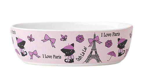 I Love Paris, oval cat bowl in Pink/White has a 2 cups capacity. It features a scattered design around the exterior of a French-themed cat, the Eifel Tower, ribbons and flowers. The words “I Love Paris” and “Ooh La La” are also scripted on the exterior. In the basin is a French-themed cat logo with “I Love Paris” scripted under the logo
