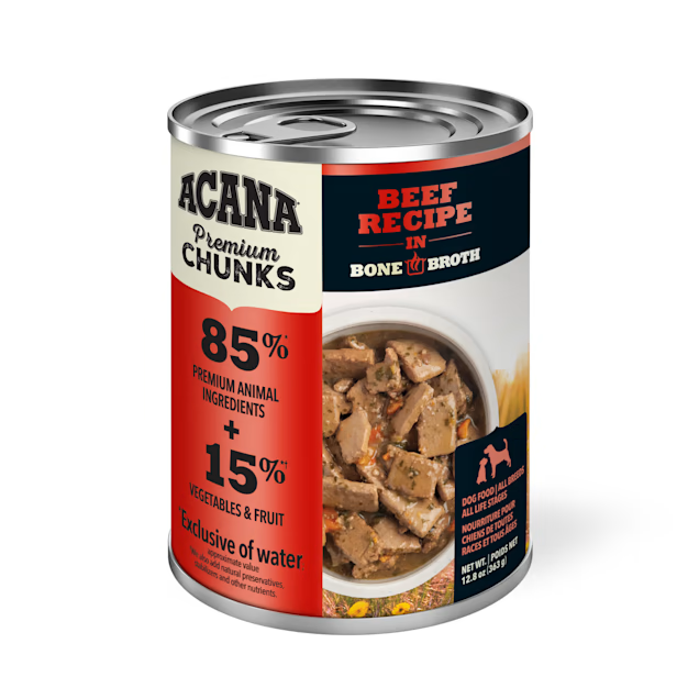 Every can of ACANA™ Premium Chunks is crafted thoughtfully from start to finish. Our Beef Recipe in Bone Broth is crafted with 85%* animal ingredients in the form of premium chunks of beef and lamb. It's also balanced with 15%*† visible fruit and vegetables in a savory bone broth base your dog will love. Add it as a topper on your dog's favourite ACANA kibble to provide them with more hydration and crave-worthy flavour, or feed alone for an indulgent treat at mealtime.