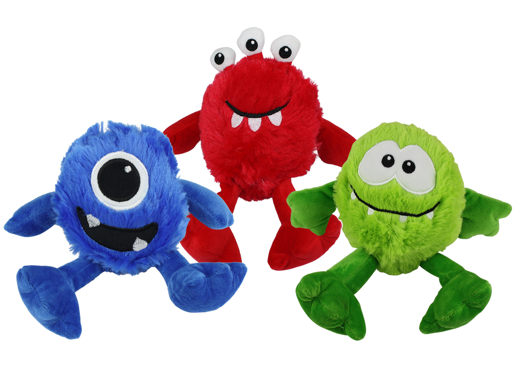 JUMBO These plush monsters aren’t your typical monster. Their happy faces will make anyone smile. They are equipped with an extra-large squeaker to entice play and will make the best cuddle companion. Each monster features a different facial expression and is available in red, green and blue.