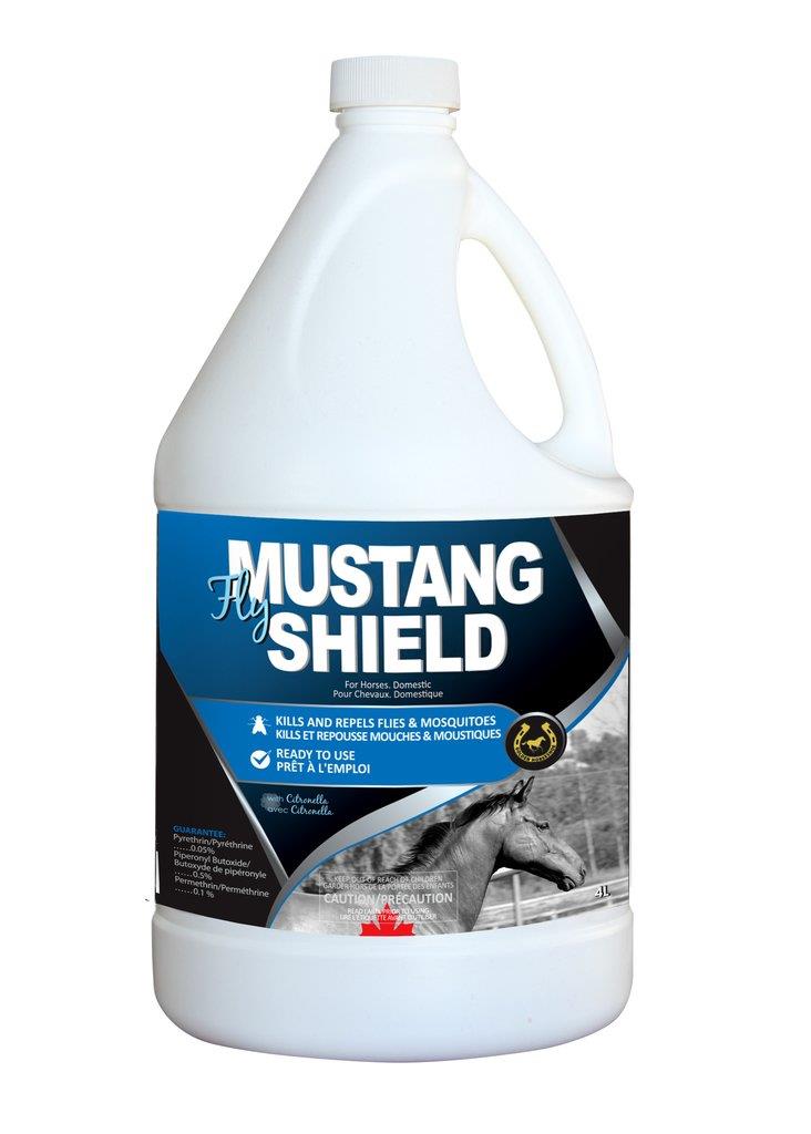 Kills and repels stable flies, horse flies, deer flies, house flies, horn flies, mosquitoes, biting midges, fleas, chiggers and lice. Mustang Fly Shield contains 0.05% Pyrethrin, 0.5% Piperonyl Butoxide and 0.1% Permethrin Made in Canada.